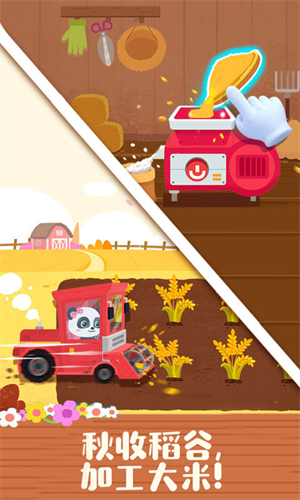 “春种秋收”,秋天就是收获的季节!驾驶农耕机收割稻谷,把稻谷晒干后放入机器加工,最后变成一粒粒洁白的大米。赶紧来帮忙吧,看着劳动成果满满的感觉真是特别棒!